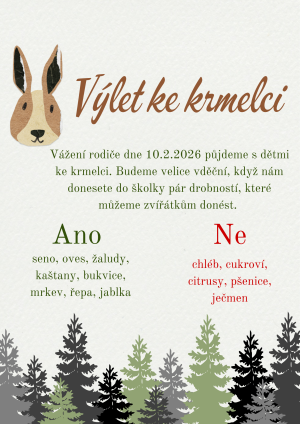 V úterý 10. února půjdeme s dětmi ke krmelci. Budeme velice vděční, když nám donesete do školky pár drobností, které můžeme zvířátkům donést.